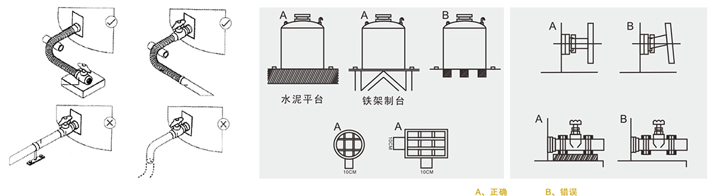 6.與儲罐下部接頭或法蘭連接的管子要垂直于桶壁,最好使用軟連接,以免裝滿液體后,桶壁上下不均勻膨脹導致接頭受損導致泄漏,嚴重時損壞接頭和桶體。
